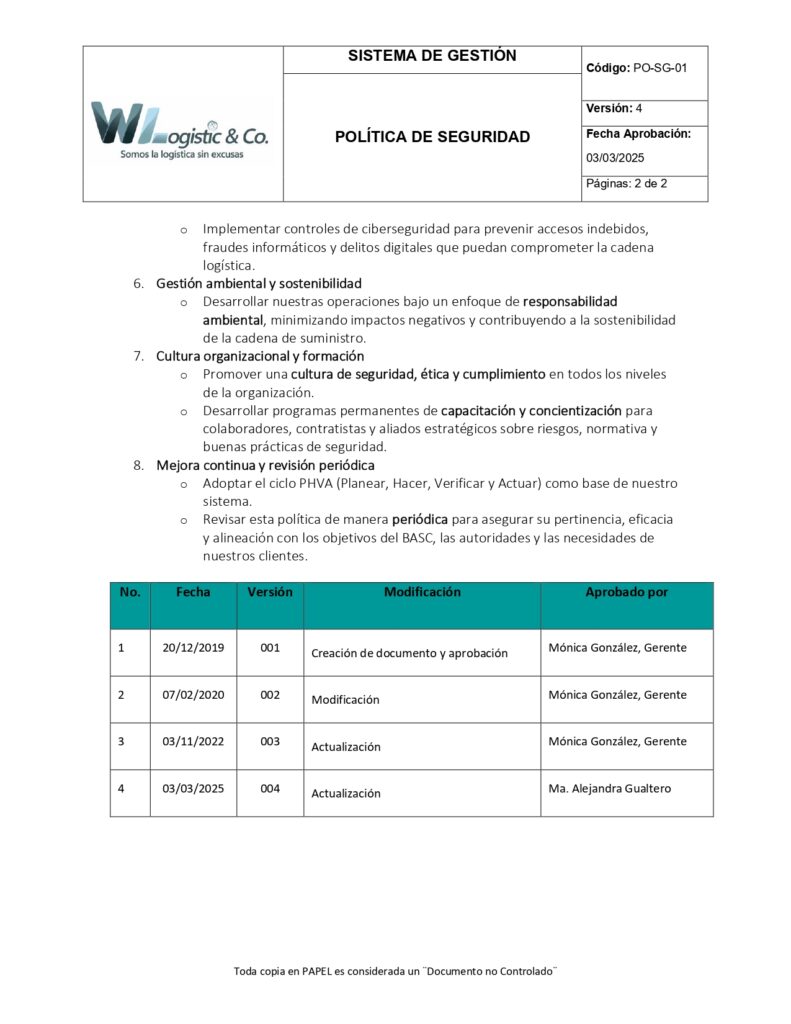 Revisar esta política de manera periódica para asegurar su pertinencia, eficacia y alineación con los objetivos del BASC, las autoridades y las necesidades de nuestros clientes.