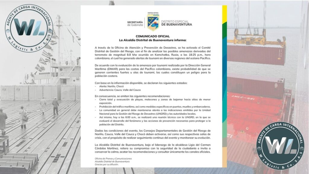 De acuerdo con la evaluación del tsunami realizada por la Dirección General Marítima (DIMAR), para las costas del Pacífico Colombiano, existe probabilidad de que se generen corrientes fuertes u olas de tsunami, las cuales constituyen un peligro para la población costera.
